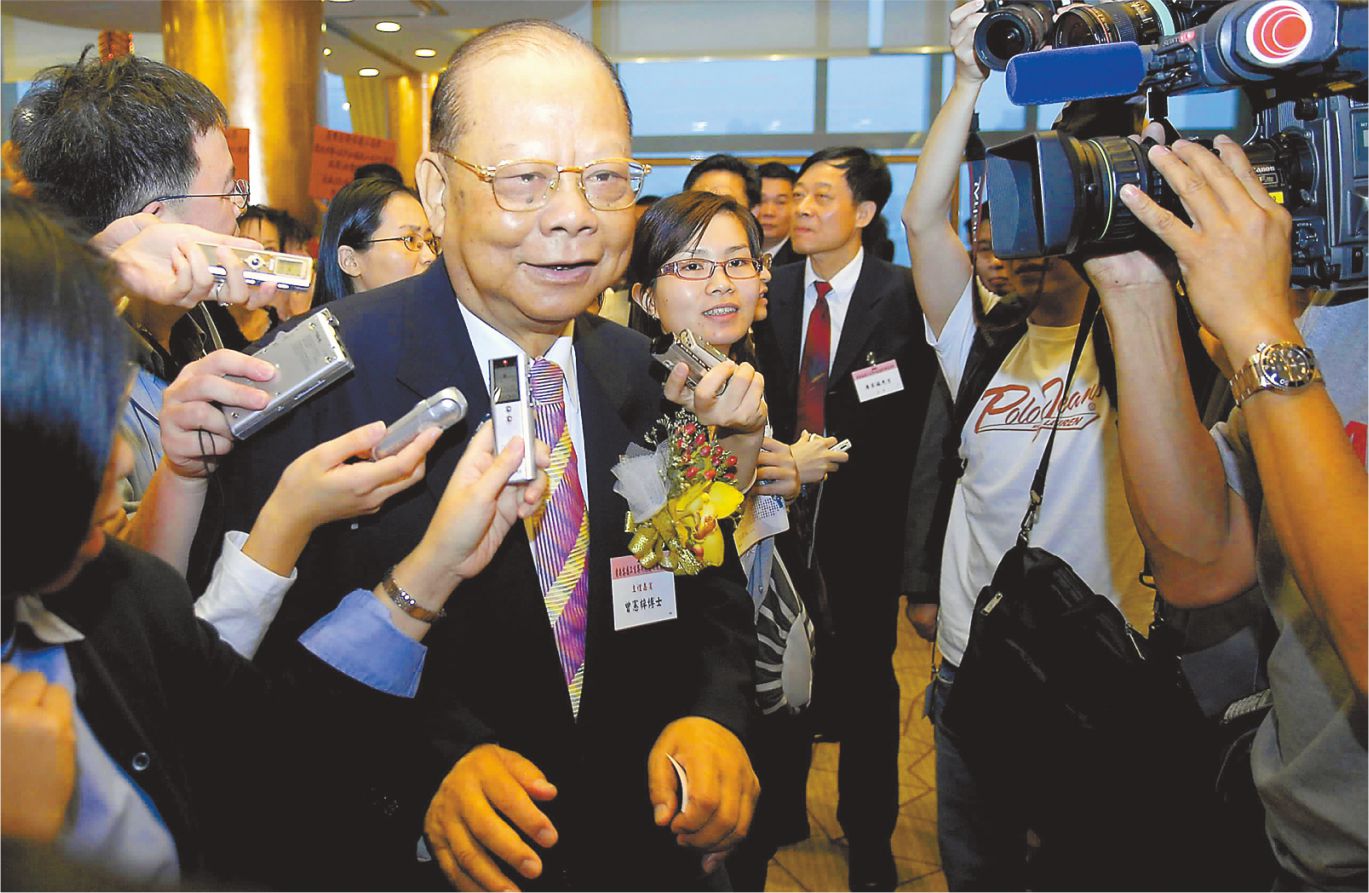 图说:曾憲梓經常在受訪時「爆金句」,因此深受傳媒同業愛戴,每次出席公開場合,例必受到記者追訪。 (新華社圖片)