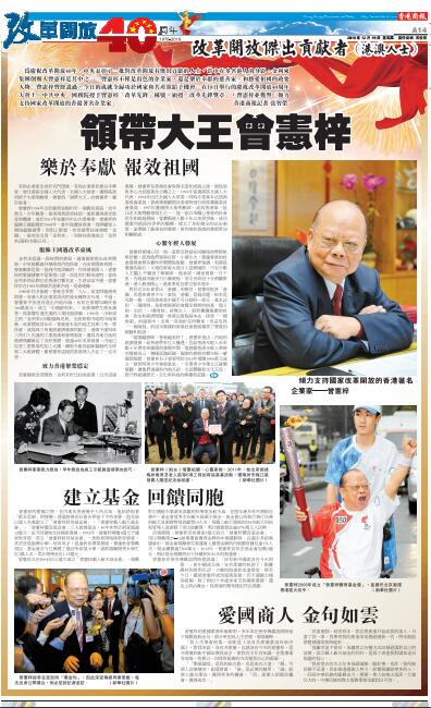 為慶祝改革開放40年,中央表彰了一批對改革開放有傑出貢獻的人士,當中有多名港人的身影,金利來集團創辦人曾憲梓是其中之一。曾憲梓不僅是出色的企業家,還是樂於奉獻的慈善家,和熱愛祖國的政要人物。曾憲梓曾經說過,今日的成就全歸功於國家和共產黨給予機會。在18日舉行的慶祝改革開放40周年大會上,中共中央、國務院授予曾憲梓「改革先鋒」稱號,頒授「改革先鋒獎章」,曾憲梓並獲譽「傾力支持國家改革開放的香港著名企業家」。 香港商報記者 張智榮