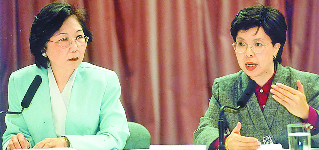 图说:陳馮富珍積極推動中醫藥發展。圖為1999年她在任香港衛生署署長期間,與衛生福利局局長霍羅兆貞(左)在中醫藥條例簡報會上,講述有關條例內容。