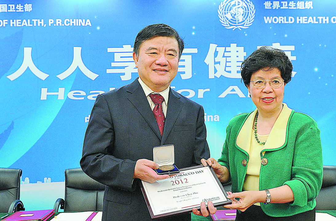 图说:陳馮富珍任職世衛組織總幹事期間曾多次回訪祖國,包括2012年7月在北京向中國衛生部部長陳竺頒發控煙獎狀。 (新華社圖片)
