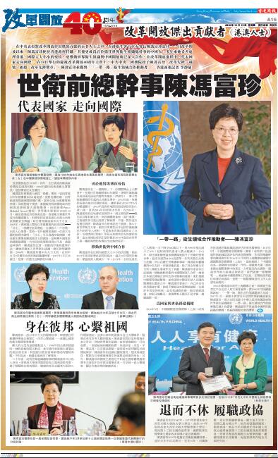 在中央表彰對改革開放作出傑出貢獻的百名人士之中,香港衛生署首位女署長陳馮富珍是其一。自改革開放以來,陳馮富珍便於香港政府任職,其後更成為首位擔任世界衛生組織總幹事的中國人。多年來她妥善處理香港、國際大大小小的疫情,更推動世界衛生組織與中國開展廣泛深入合作,在改革開放進程中,代表國家走向國際。 在18日舉行的慶祝改革開放40周年大會上,中共中央、國務院授予陳馮富珍「改革先鋒」稱號,頒授「改革先鋒獎章」,陳馮富珍並獲譽「『一帶一路』衛生領域合作推動者」。 香港商報記者 李靜儀