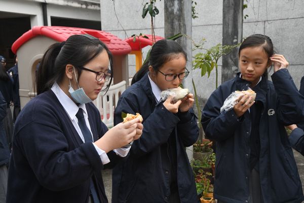 同學試食婆婆製作的茶粿,滿口香甜。 記者 蔡啟文攝
