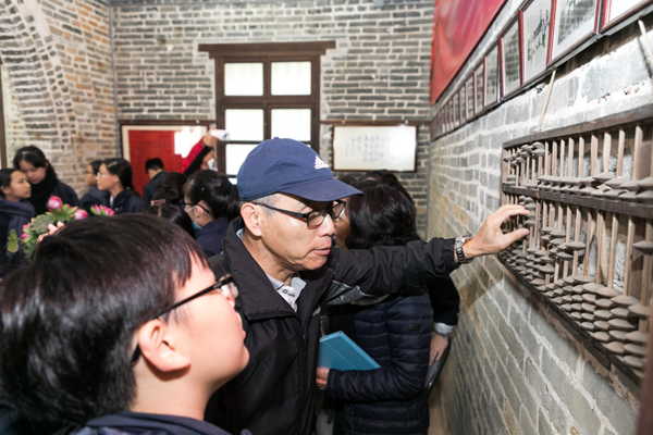 同學們在製作茶粿後,參觀鄧氏宗祠、友恭學校。在該校陳列的眾多文物中,掛在牆上的木製算盤吸引了他們。早年在英國列茲大學獲頒計量經濟哲學博士學位的葉偉彰向同學們介紹,在未有電子計算器的年代,算盤是中國傳統的計算工具,歷史悠久。只要背熟珠算口訣,就可以加、減、乘、除。他笑言,惟除法在珠算時較難掌握。
