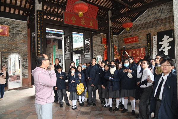 鄉議局元朗區中學師生於元朗廈村鄧氏宗祠聆聽導賞員(左)介紹有數百年歷史的宗祠建築風格。