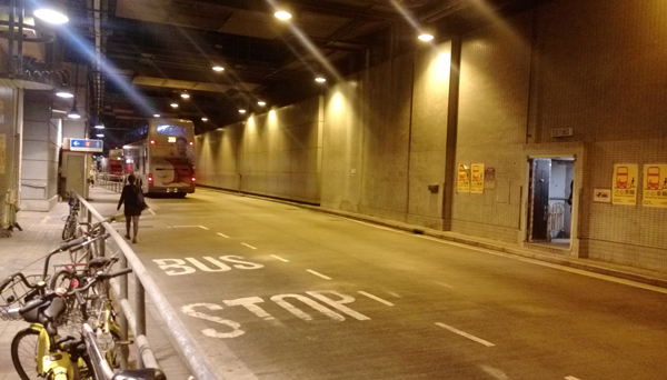 荃灣西公共運輸交匯處的出入口非正式行人通道,雖貼有小心車輛警示,但無論司機及行人都無法清楚得悉路面情況。