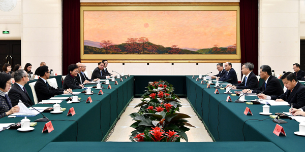 特首林鄭月娥昨率港府代表團北上廣州與廣東省委書記李希、廣東省長馬興瑞等廣東省領導會晤,共同謀劃發力粵港澳大灣區建設。