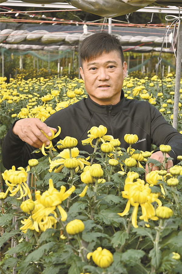 李永強精心呵護蟹爪狀的菊花。