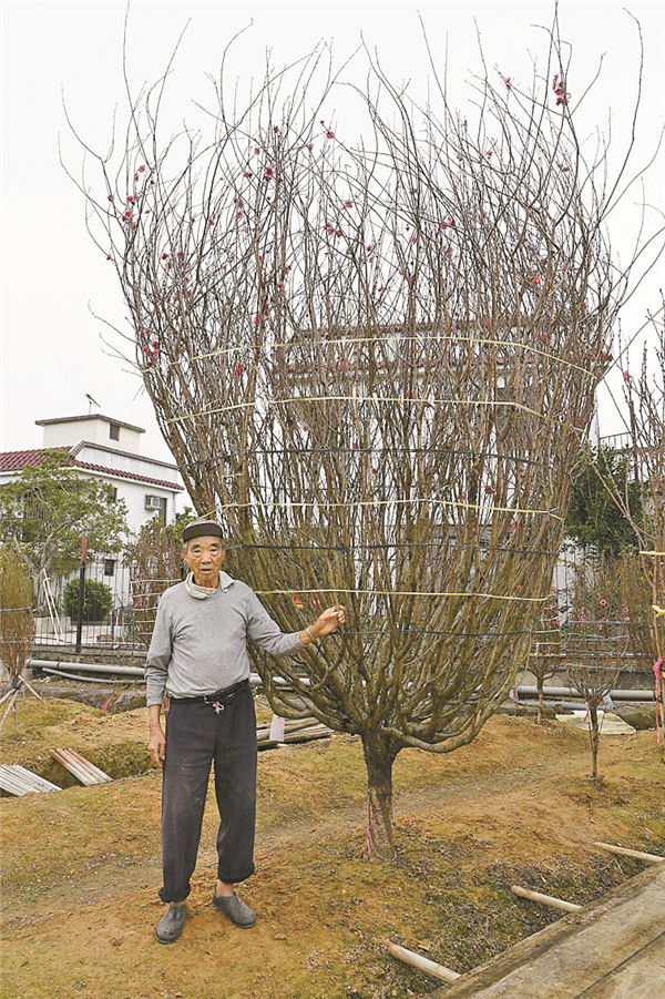 馮伯稱颱風「山竹」來臨前,他和工友共4人護住大棵桃花,搶建加固,令13呎高的桃花長勢喜人。