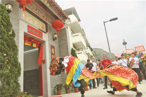 本月19日重光典禮當天,天公作美,上午11時半,族人先舞動瑞獸麒麟前往深井三處地方參拜大王爺及伯公。到下午約1時,進伙儀式開始,主禮嘉賓荃灣鄉事委員會主席鍾偉平及荃灣民政事務處專員葉錦菁為宗祠啟鑰,他們其後亦為宗祠重修碑記主持揭碑。