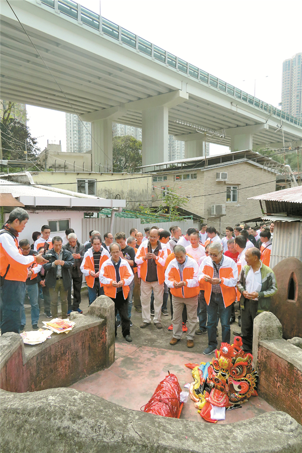 進伙儀式前,參拜土地伯公,後方天橋就是屯門公路。