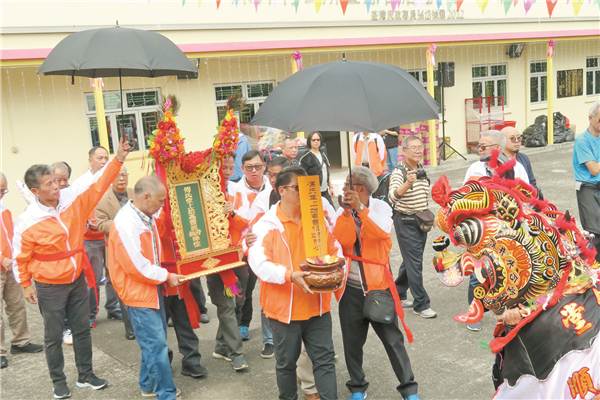 宗親們在麒麟引領下,手捧先祖靈牌和香爐離開深井村公所。 記者 鄭玉君攝