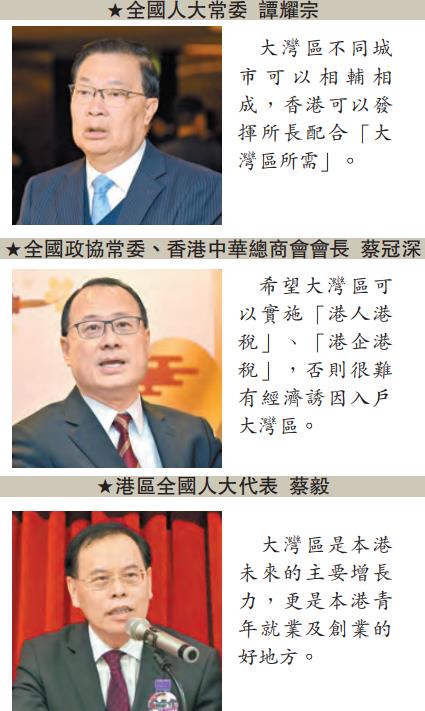 蔡毅則指,即將公布的大灣區規劃綱要,一定是可以推動大灣區發展的好規劃,將指明這一區域的未來發展方向。他直言,大灣區對於香港十分重要,因為這是香港未來發展的主要增長點,更是全方位發展的關鍵所在。他希望香港可以盡快融入大灣區建設,令製造業、創科、航運、物流等行業受惠。他又特別提及,大灣區對於本港青年而言,更是就業、創業的最理想地方。