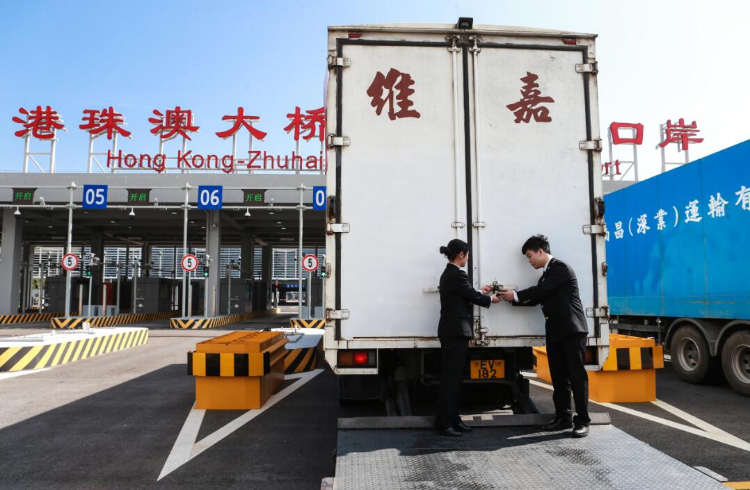 粵港兩地海關快速通關模式在港珠澳大橋1月成功對接,圖為首票貨物順利驗放。 中新社