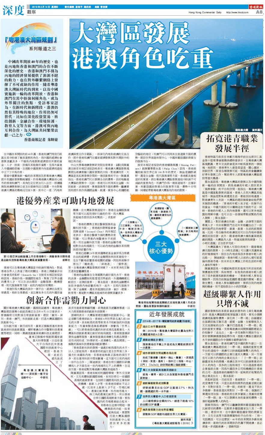 隨着中國實施新一輪的改革開放及將粵港澳大灣區提升到國家發展戰略層面,作為粵港澳大灣區核心城市的香港和澳門,其角色定位更加引人注目。根據國務院港澳事務辦公室主任張曉明近日透露,中央對粵港澳大灣區的戰略定位有5個,其中之一是「內地與港澳深度合作示範區」,即深化內地和港澳的交流合作,提升香港和澳門在國家經濟發展和對外開放中的地位與功能。