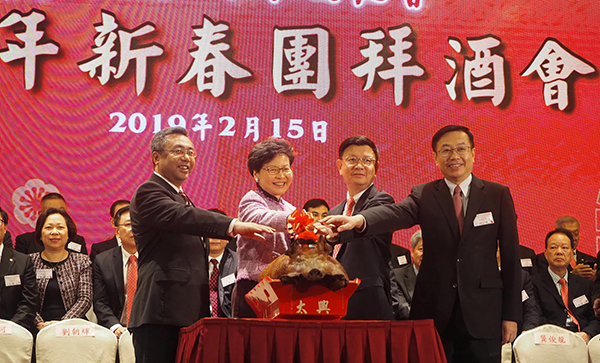 【香港商報网訊】記者郭天琪報道:香港廣東社團總會己亥年新春團拜酒會昨日舉行,行政長官林鄭月娥、中聯辦副主任何靖、外交部駐港副特派員楊義瑞、駐香港部隊副參謀長劉朝暉等蒞臨主禮,並與該會首長共同切金豬,恭祝祖國繁榮昌盛,香港國泰民安。林鄭月娥讚揚該會對香港的貢獻,她表示,中央政府即將公布《粵港澳大灣區發展規劃綱要》,香港作為粵港澳大灣區的成員,特區政府一定會與中央相關部委、廣東省政府和澳門特區政府保持緊密聯繫,一起把大灣區建設成宜居宜業宜遊的城市群。