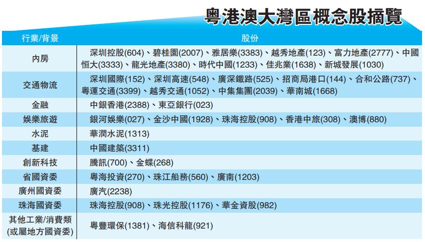 在《粵港澳大灣區發展規劃綱要》出爐後,大灣區概念股更清晰,而且受惠板塊更廣泛,不再停留於內房及中資金融等板塊,還有交通物流、娛樂旅遊、水泥、基建、創新科技及綜合行業等,且看下文盤點受惠大灣區發展的行業,大灣區概念股逐隻捉。