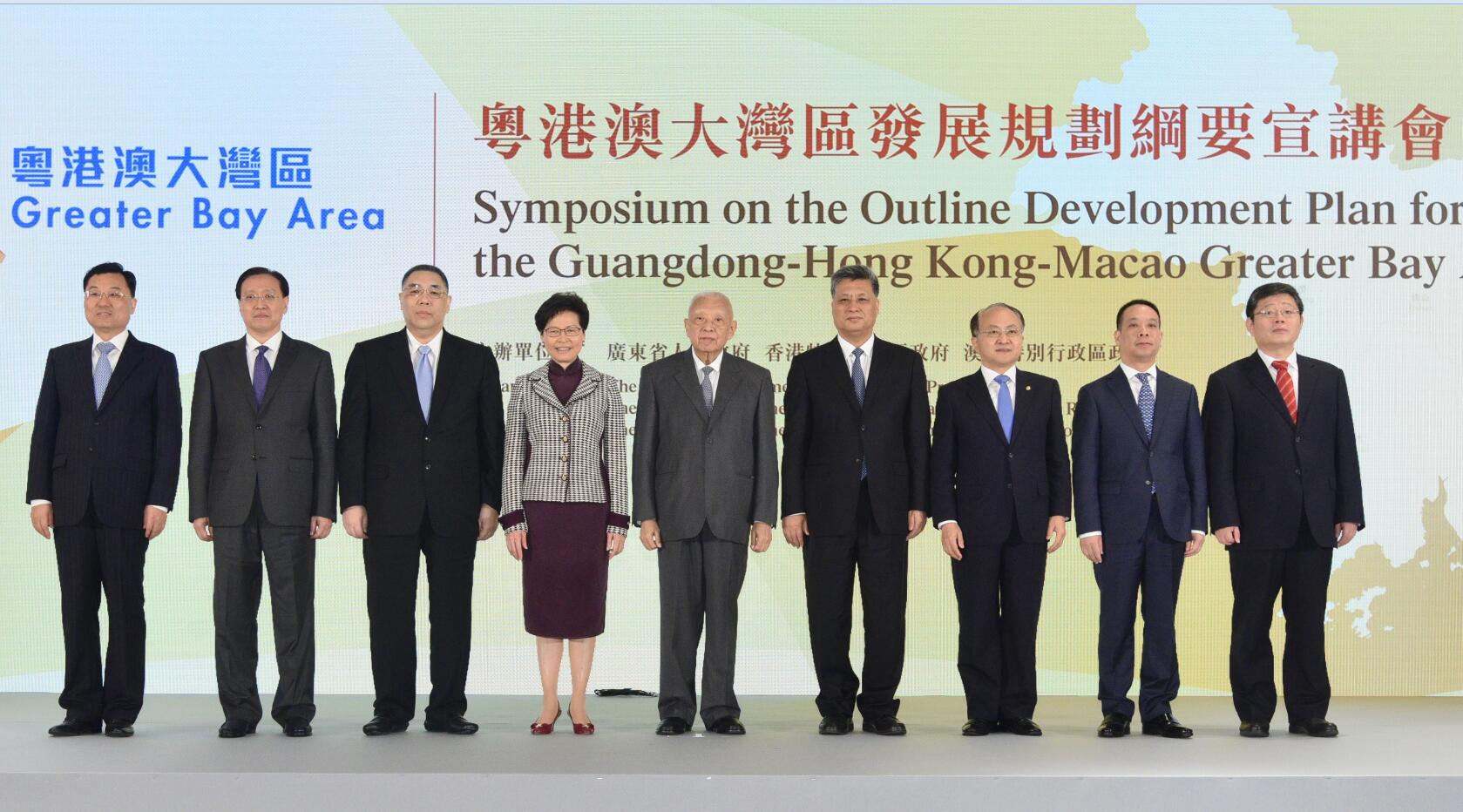 全國政協副主席董建華(左五)、特首林鄭月娥(左四)、廣東省省長馬興瑞(左六)、澳門特首崔世安(左三)、中聯辦主任王志民(左七)、粵港澳大灣區建設領導小組辦公室副主任林念修(左二)、港澳辦副主任黃柳權(左八)、外交部駐港特派員公署特派員謝鋒(左一)、國家發改委地區經濟司司長郭蘭峰(左九)一同出席《粵港澳大灣區發展規劃綱要》宣講會。