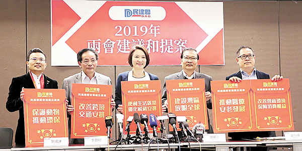 民建聯昨日召開記者會,公布將於人大政協兩會會議提交的24項建議和提案,出席的有主席兼全國政協委員李慧琼、副主席彭長緯,會務顧問兼全國人大常委譚耀宗;副主席兼港區全國人大代表陳勇、會務顧問葉國謙。至於該黨另一位全國政協委員、立法會議員梁志祥因地區工作未能出席記者會。
