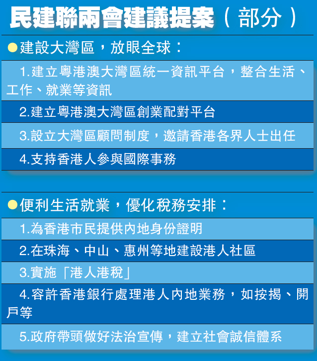 民建聯的人大建議及政協提案共分6項範疇,其中之一是「建設灣區,放眼全球」。建議內容有建立粵港澳大灣區統一資訊平台,以整合生活、工作、就業、學業等方面的資訊,包括具體流程指引,並希望各部門可以簡化香港企業或個人到內地生活、就業、創業的手續。建立大灣區創業配對平台,整合公司註冊、稅務資訊、工商法律等,並簡化香港企業或個人到內地創業及投資的手續。設立大灣區顧問制度,邀請香港各界人士出任顧問,發揮諮詢角色,由特區政府收集他們意見,令相關重大政策更加完善;支持港人參與國際事務,提名港人到國際組織的推薦名單之中,如國際公務員等等。