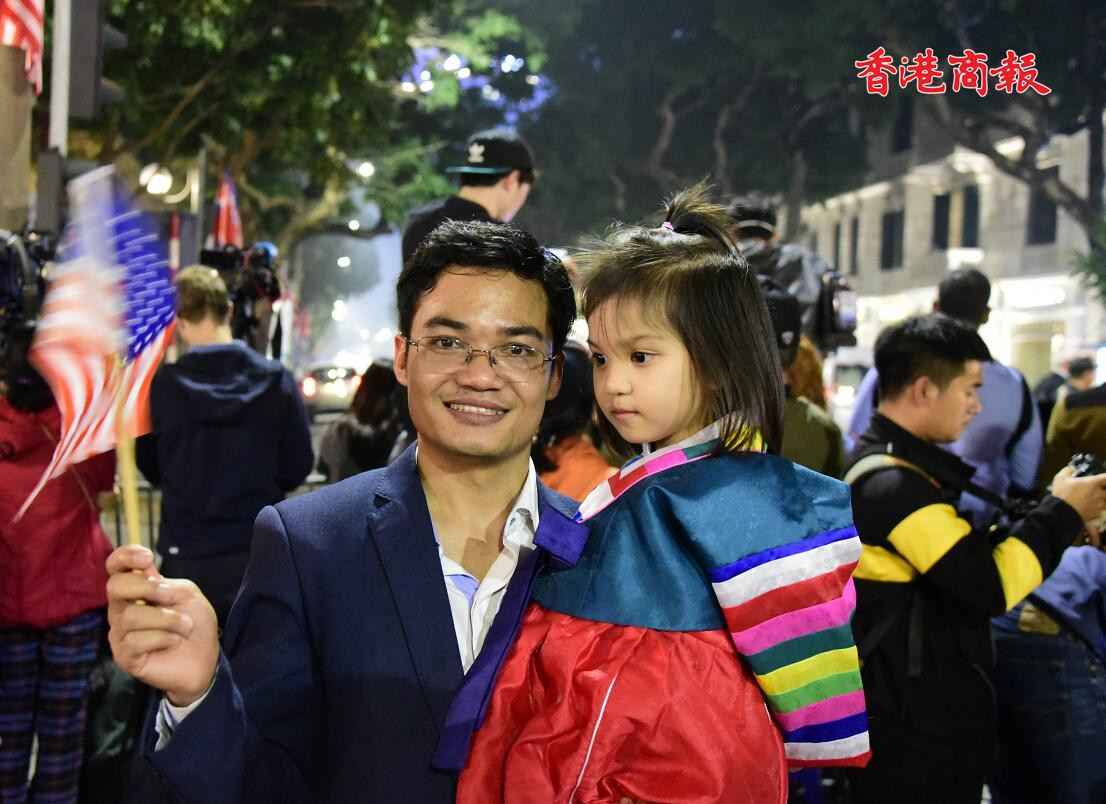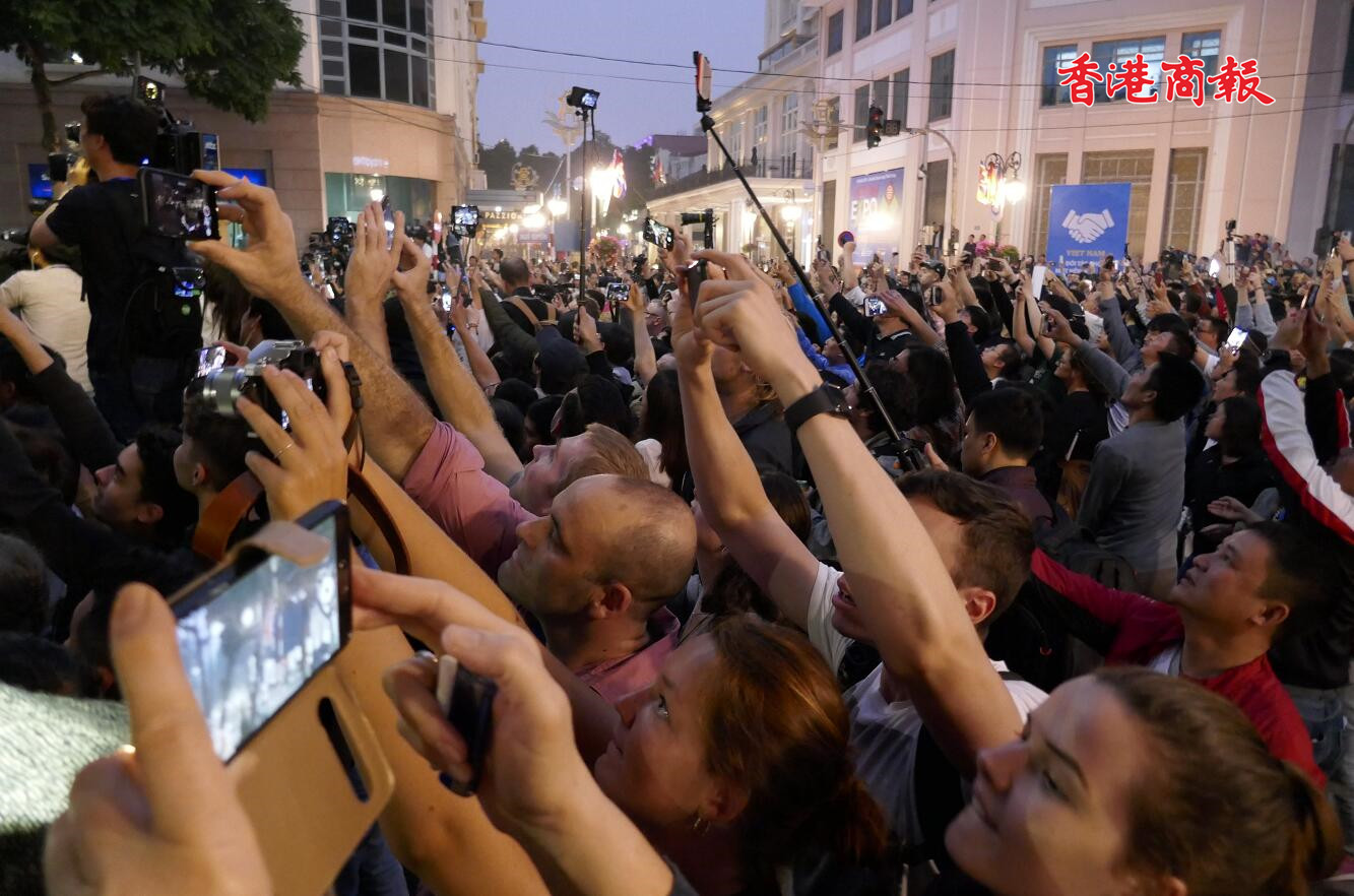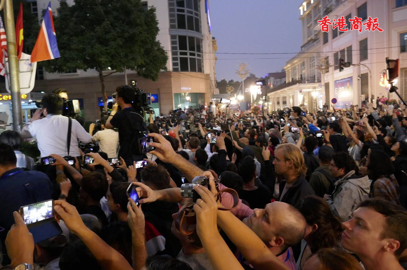 【香港商報网訊】特派記者梁希賢、黃兆琦報道:朝美河內峰會舉世矚目,在美國總統特朗普與朝鮮領導人金正恩首日會面地點-河内大都市索菲特傳奇酒店(Sofitel Legend Metropole Hanoi),昨天傍晚聚集數以百計的人群,人人高舉手機或相機推個不停,場面十力壯觀。峰會議題雖然十分嚴肅,但群都是面露笑容和送上祝福,也有一些外國遊客邊等待邊喝啤酒,表現著躍興奮,仿如一場小型嘉年華會。