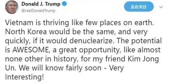 越南是世界上少有的繁荣国家。如果朝-鲜愿意无核化,那么它也将同样繁荣,而且非常迅速。(朝-鲜)潜力巨大,对于我的朋友金-正-恩来说,这是一个前所未有的伟大机遇。很快我们就会知道,非常有趣!