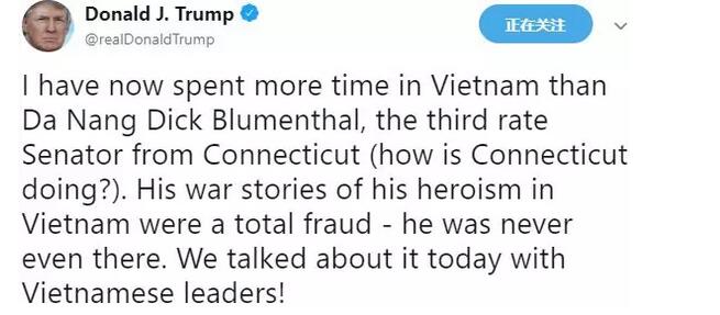 **背景介绍:Blumenthal,康涅狄格州民主党参议员,竞选期间谎称自己参加过越战,是枪林弹雨中走过的英雄。后来经考证,他压根没去过越南。川谱经常拿这件事在推特上调侃、抨击。