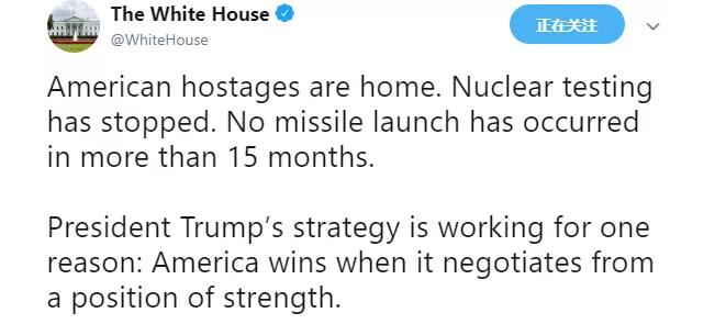 白宫推文:美国人质回家了,核试验也停止了,已有超过15个月没有发射导弹了。川谱总统策略奏效的原因之一是:当美国在谈判中占据优势地位时,我们就赢了。