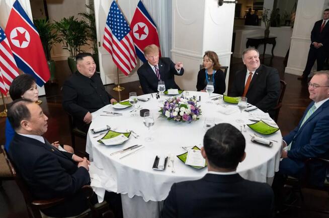 19点40分左右,二人开始一对一单独会谈。会谈结束后,就是外交晚宴。参加晚宴的主要人士有,美国方面:总统川谱、国务卿蓬佩奥和代理白宫办公厅主任马尔瓦尼。朝-鲜方面:金-正-恩、副委员长金-英-哲和外交部长李-勇-浩。