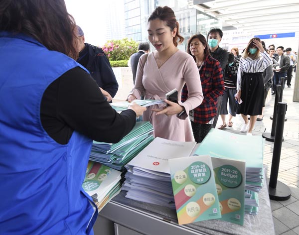 政府派發財政預算案小冊子,大批市民排隊領取。 記者 崔俊良攝