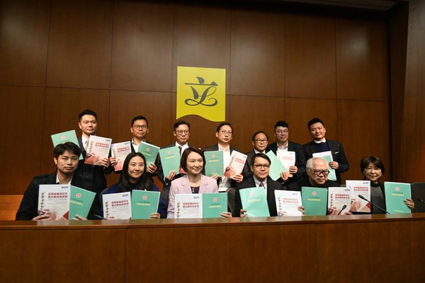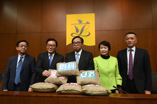 經民聯議員(左起)劉業強、林健鋒、盧偉國、梁美芬、吳永嘉指預算案穩中有進。 記者 蔡啟文攝