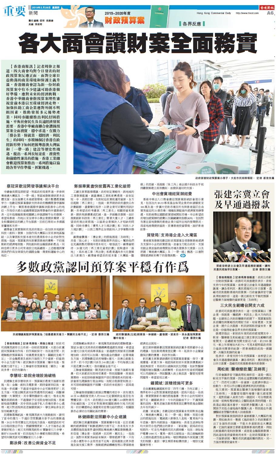 政務司司長張建宗表示,這一份預算案以「撐企業、保就業、穩經濟、利民生」為大方向的主題。在確保公共財政穩健的前提下,預算案採取具前瞻性與策略性的理財方針,培育產業、支援企業、提升公共服務、利民紓困和投資未來,實在是一份值得社會各界支持的預算案。
