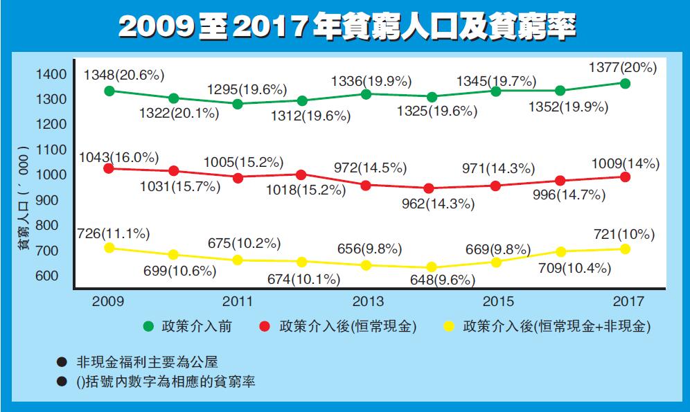 根據2018年11月政府發布的「香港貧窮情況報告」,2017年全港貧窮人口有137.7萬,貧窮率達20.1%,貧窮人口再創過去9年以來新高,即平均每5個港人就有一個屬貧窮人口。