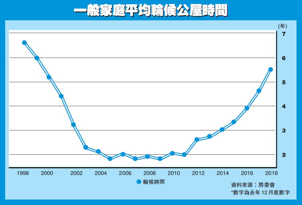 根據房委會提供的一般家庭平均輪候公屋時間,從2011年起,公屋輪候時間不斷上升,更於2018年3月打破5年的關口,再創19年新高。