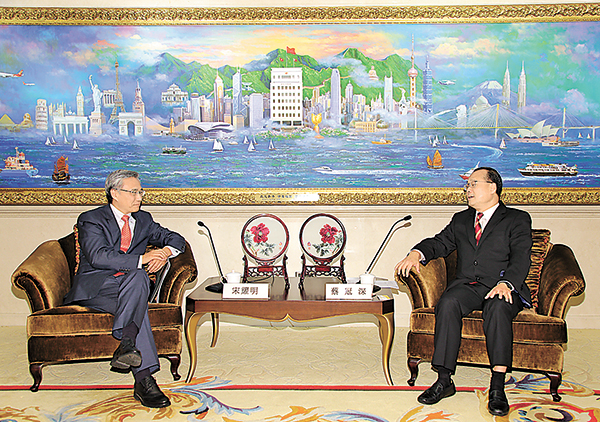 中國駐日本大使館經濟商務處宋耀明公使日前率領在日中國企業協會代表團一行到訪中總,與會長蔡冠深、副會長劉鐵成和胡曉明及多位常會董進行了交流,雙方就如何善用「一帶一路」及大灣區機遇,全面融入國家發展交換意見。蔡冠深指出,目前中日關係變暖,正是探討如何加強兩地交流,共同發展的好時機。事實上雙方可合作的領域不少,包括金融服務、醫療護理、銀髮市場、環保技術、人工智能及聯合開發第三方國家投資基礎建設等。