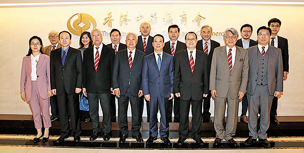 國務院港澳辦副主任黃柳權(左五)日前訪問香港中華總商會,與中總會長蔡冠深(右三)等多名首長、常務會董及會董會面,就剛出台的粵港澳大灣區發展規劃綱要交流意見。