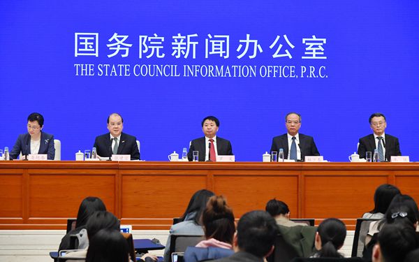 昨日,政務司司長張建宗在北京出席《粵港澳大灣區發展規劃綱要》新聞發布會。(左二起)張建宗、國家發展和改革委員會副主任羅文、廣東省常務副省長林少春及澳門特別行政區政府政策研究和區域發展局局長米健回應記者提問。中通社