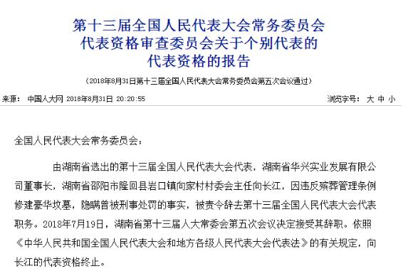 根据公告,向长江是因违反殡葬管理条例修建豪华坟墓,隐瞒曾被刑事处罚的事实,被责令辞去第十三届全国人大代表职务。