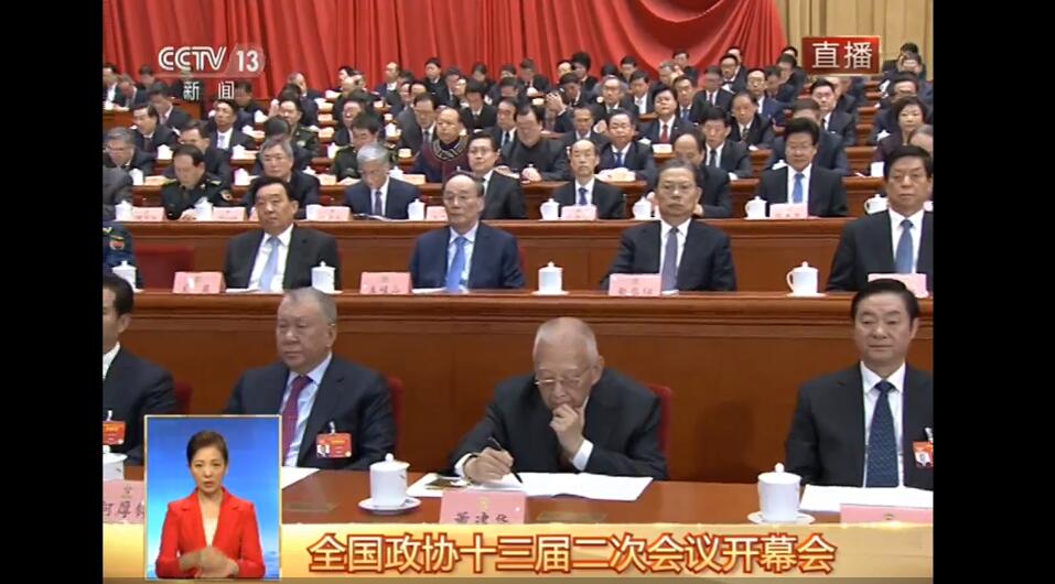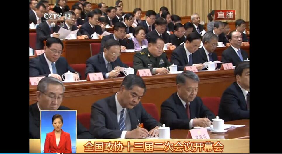 下午3点整,全国政协副主席张庆黎宣布,中国人民政治协商会议第十三届全国委员会第二次会议正式开幕。请全体起立,唱国歌。