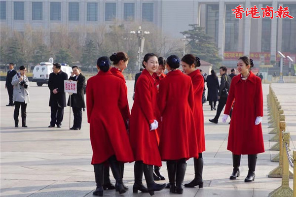 人民大会堂外,女工作人员统一白手套、黑皮靴,身着红大衣特别喜庆。
