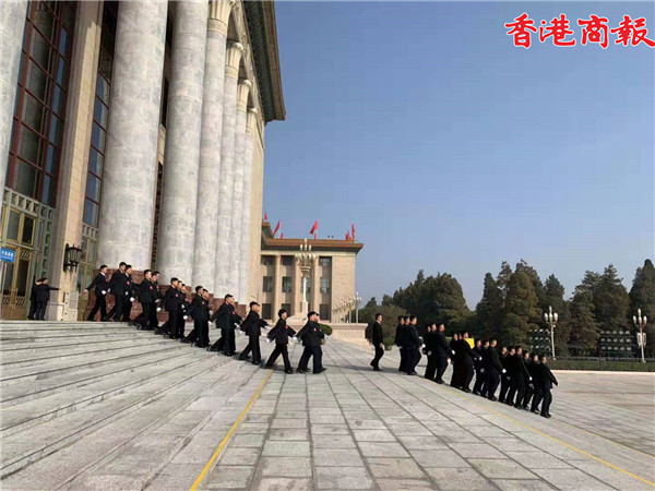 工作人员整齐列队走出大会堂。