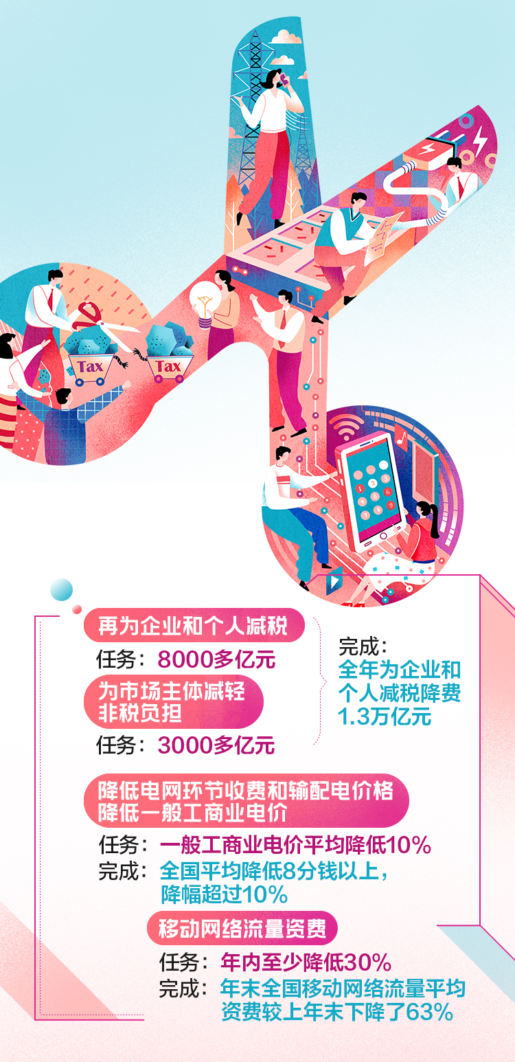 减税降费:将制造业等行业现行16%的增值税税率降至13%。全年减轻企业税收和社保缴费负担近2万亿元。