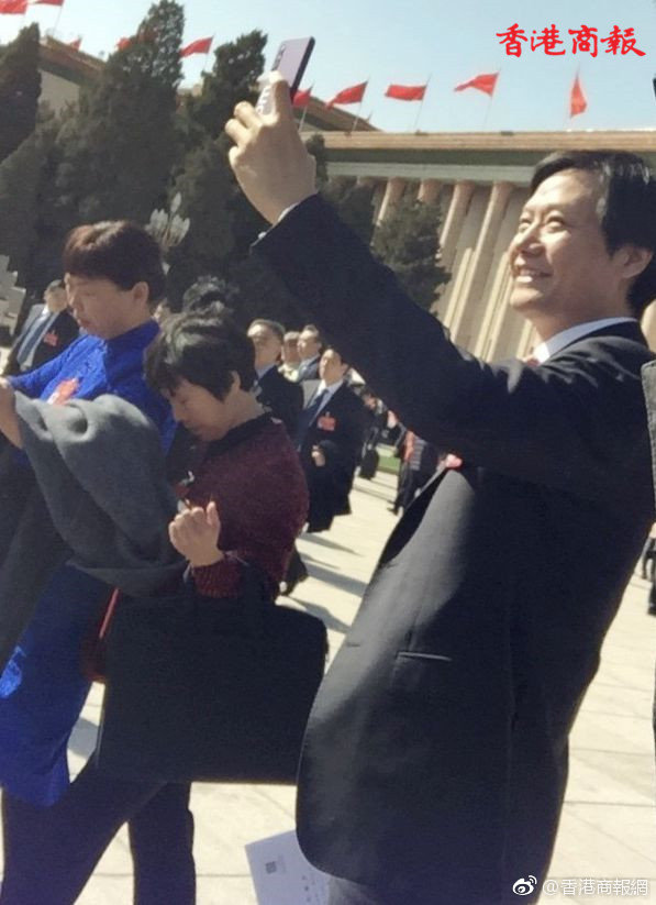 走出大会堂,雷军心情大好玩自拍。