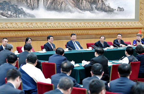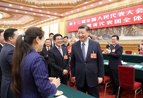 3月7日,中共中央总书记、国家主席、中央军委主席习近平参加十三届全国人大二次会议甘肃代表团的审议。 新华社