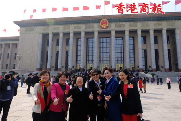 5位港区人大女代表及全国人大常委会香港基本法委员会副主任谭惠珠(左三)在人民大会堂门口合影。