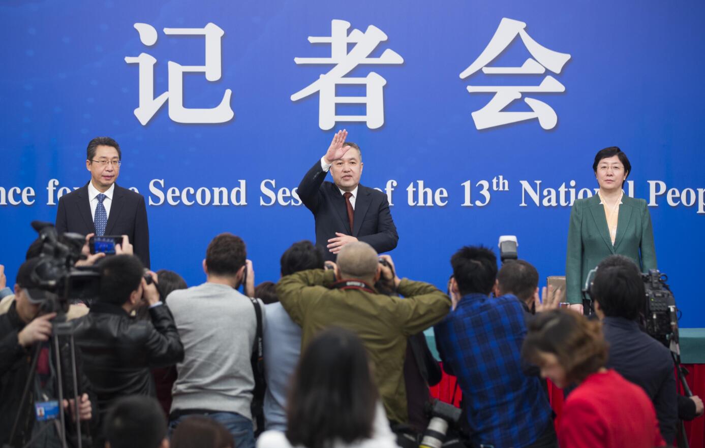 十三屆全國人大二次會議新聞中心昨舉行記者會,國家市場監督管理總局局長張茅(中)、國家藥品監督管理局局長焦紅(右)、國家知識產權局局長申長雨(左)回答中外記者提問。中新社