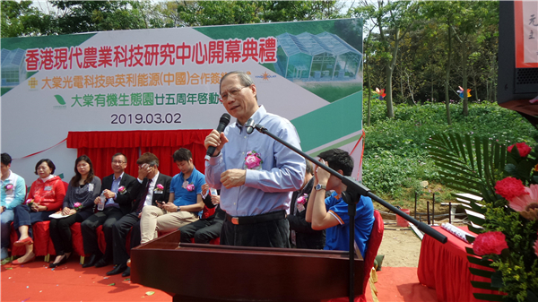 漁護署助理署長馬惠忠致辭時讚揚,香港現代農業科技研究中心成立,令香港在可持續發展、邁向高產值及高科技農業又多一支生力軍。他期盼中心成立後的未來趨勢是有更多人士投身、更多集團投資農業,為香港可持續發展投入一份貢獻。馬惠忠指出,香港農業人才、技術及運銷等方面存在的問題是:從業人員老化;害蟲管理、病蟲防治及肥料管理有改善空間;運銷損失率大,但相信科技可以振興農業。以以色列為例,國土沙漠化,耕地(僅佔20%)及雨水(無雨期達6個月以上)不足,但該國利用許多農業科技(滴灌、生物),精耕農業,解決農業問題(出口歐洲),在過去20年農業產值上升18倍,他相信香港在新農業政策之下,有業界配合,香港農業可以拓展出一條道路。