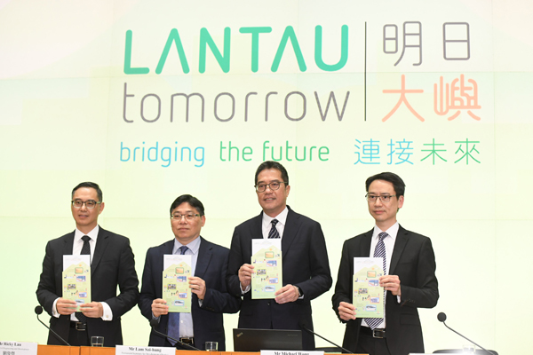 昨日,港府發展局召開記者會,公布「明日大嶼願景」工程造價初步估算為6240億港元,局長黃偉綸(右二)強調工程不會掏空香港庫房。 記者 崔俊良攝