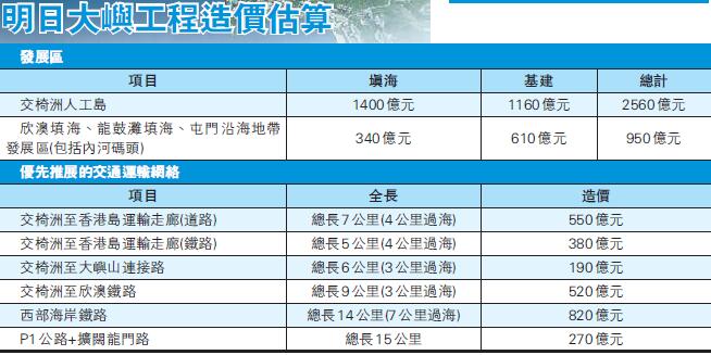 至於優先推展的交通運輸網絡方面,工程造價預料2730億元,當中造價最高的一項是總長14公里的西部海岸鐵路,造價820億元;其次是總長7公里的交椅洲至香港島運輸走廊(道路),造價550億元;交椅洲至欣澳鐵路的造價為520億元;交椅洲至香港島運輸走廊(鐵路),造價380億元;P1公路加擴闊龍門路,造價270億元;交椅洲至大嶼山連接路,造價190億元。