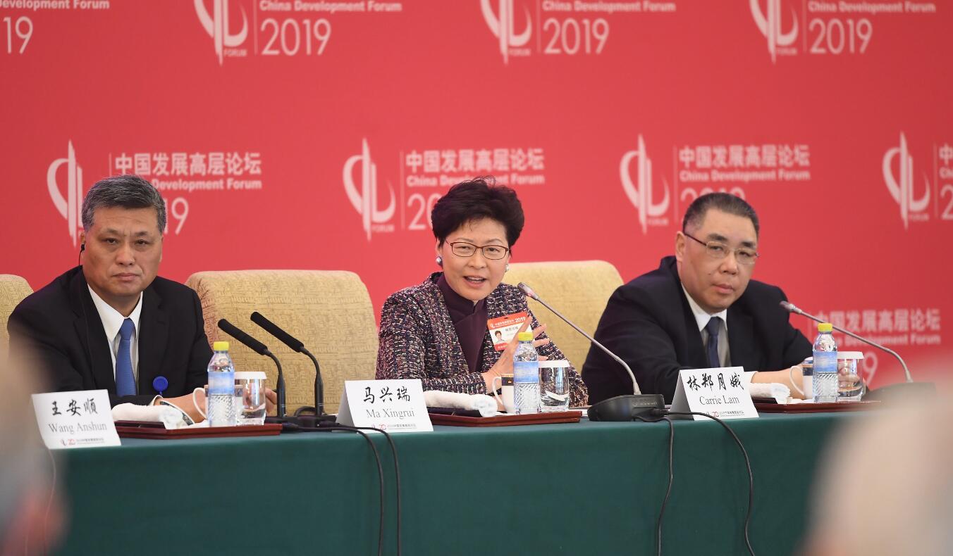 在當天上午舉行的論壇上,林鄭月娥在「全球經濟中的粵港澳大灣區」環節致辭。她表示,香港作為中國的一個特別行政區,以「一國兩制」為原則,享有高度自治,大灣區對香港是前所未有的機遇,讓香港融入國家發展大局,藉此為經濟增長注入新的動力。