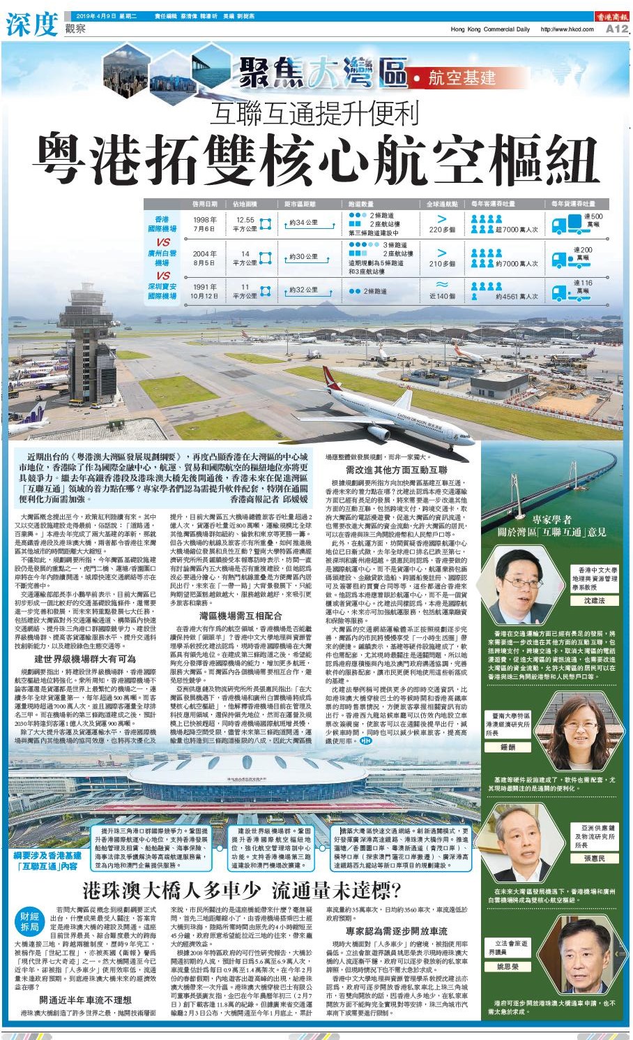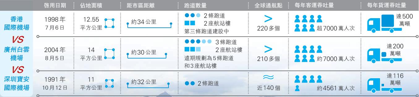 亞洲供應鏈及物流研究所所長張惠民指出:「在大灣區發展機遇下,香港機場和廣州白雲機場將成為雙核心航空樞紐」,他解釋香港機場目前在管理及科技應用領域,還保持領先地位,然而在運營及規模上已快被趕超,同時香港機場國際航班增長慢,機場起降空間受限,儘管未來第三條跑道開通,運輸量也將達到三條跑道極限的八成,因此大灣區機場應整體做發展規劃,而非一家獨大。